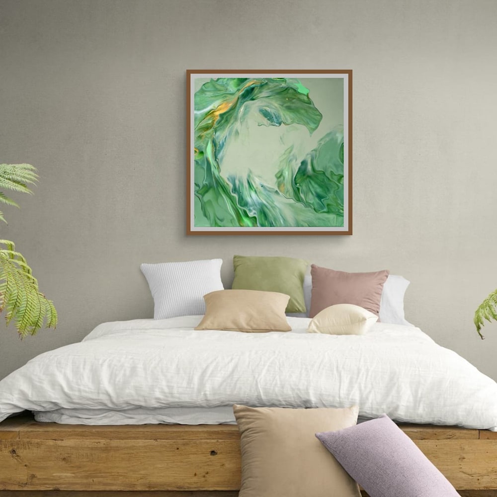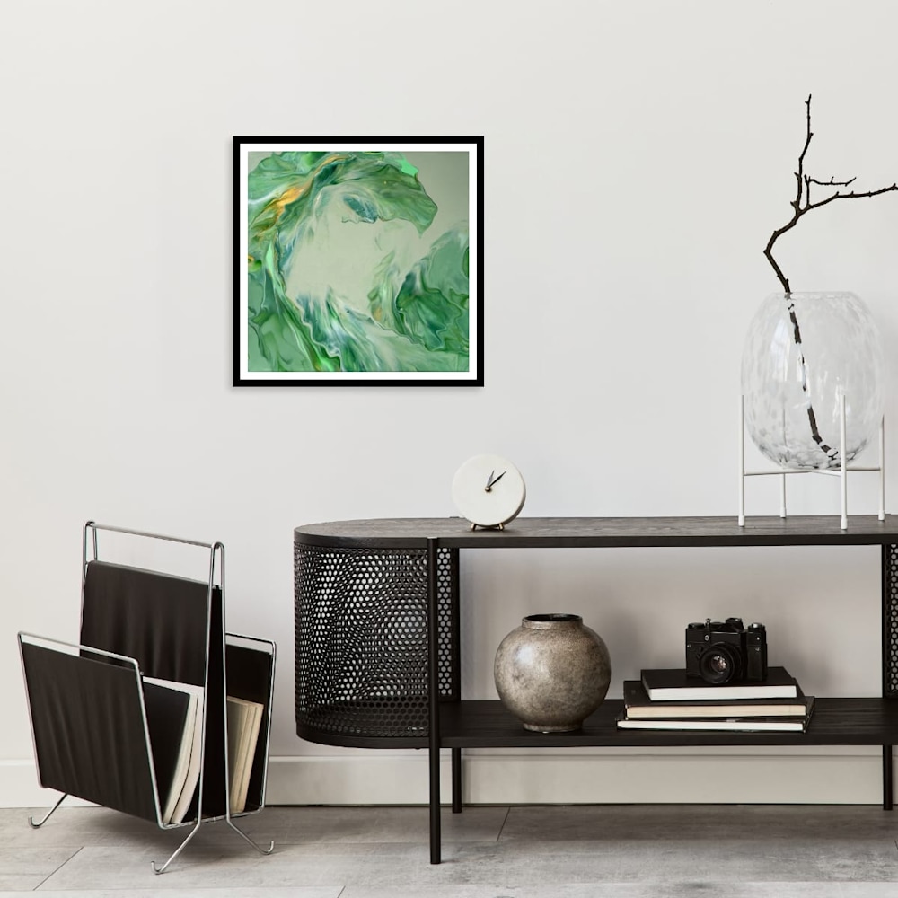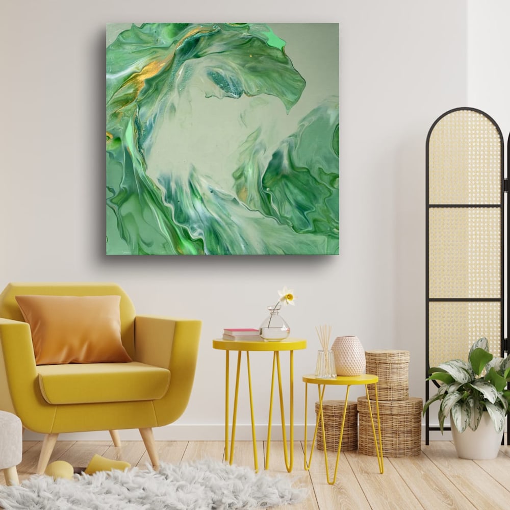 Flecks of metallic gold weave through the composition of "Emerald Wave," catching the light and adding a delicate shimmer that feels both unexpected and warmly familiar—like sunlight filtering through leaves at dawn. This piece embraces a natural rhythm, balancing flow and stillness to create a space that is calming yet quietly vibrant, encouraging a moment of thoughtful pause amid its organic forms.