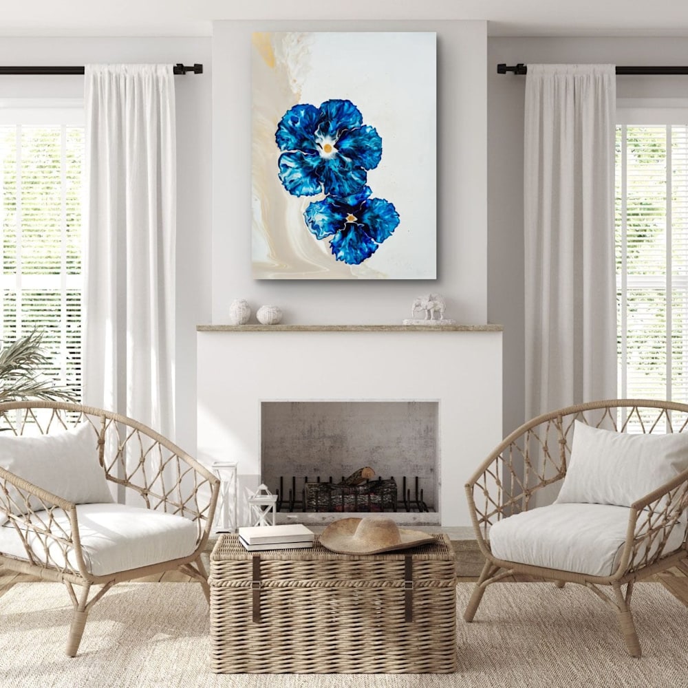 Fantasy Beach Blooms grew from a desire to explore the delicate balance between vivid life and quiet space—the way vibrant colors can emerge softly from an understated background. The two blue flowers at the center carry a sense of movement, their textured petals unfolding with fluidity and grace. There’s a contrast here between the rich cobalt and lighter azure shades, grounded by subtle golden centers that bring warmth and focus. The gentle, swirling hues in the background create a calm rhythm that lets the blooms stand out while inviting viewers to slow down and breathe in the details. I hope this piece offers a moment of quiet inspiration, a reminder that beauty can bloom even in the simplest settings.