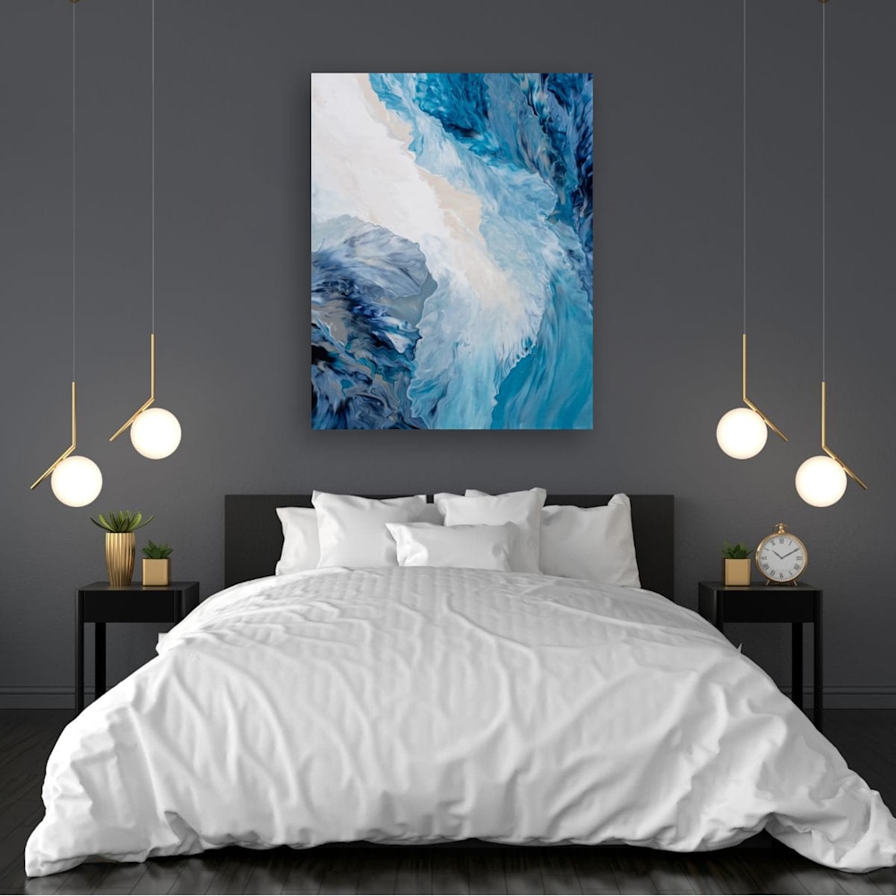 "Glacier Flow" is a whirlpool of blues—from deep navy to bright turquoise—dancing together with soft whites and beige, like the currents of a hidden glacier or clouds rolling across the sky. The surface is smooth but full of little shifts and details that keep the eye wandering. It’s like capturing a secret rhythm in nature, something alive yet calm. Creating this felt like letting the paint find its own path, and I loved watching everything swirl into place.